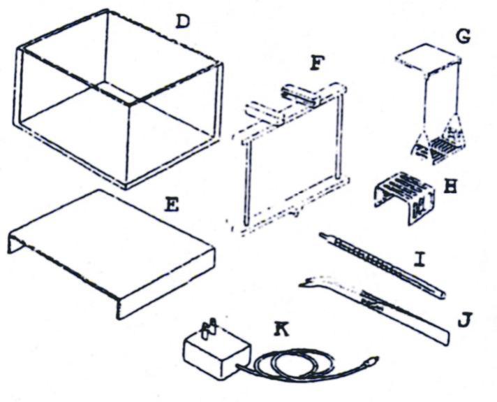 A.SD-200L本機(jī) B.防塵圈 C.200g砝碼 D.水槽 E.水槽臺 F.容器支持板 G.測定臺 H.抗浮架 I.溫度計 J.夾子 K.電源供應(yīng)器